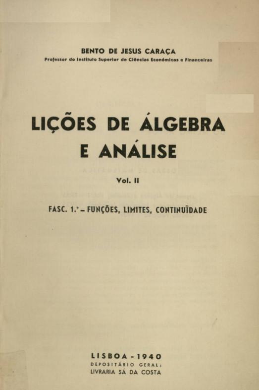 Cota ABJC_0011 Data 1940 Autor Bento de Jesus Caraça Foi publicada uma segunda edição em 1954, uma terceira edição em 1957 e uma outra em 1966 com uma variação no título que passou a Lições de Álgebra e Análise: funções, limites, continuidade