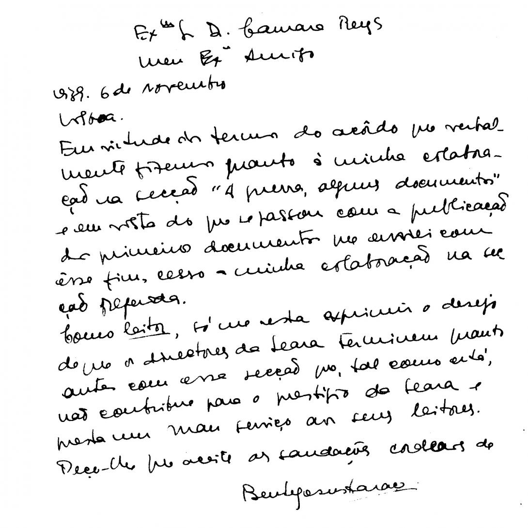 Data 06-11-1939 Bento Caraça informa Câmara Reys, diretor da Seara Nova, que cessou a sua colaboração na referida secção, considerada a continuação do tratamento incorreto dado aos documentos publicados