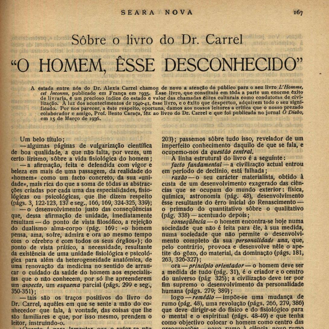 Data 22-02-1941 A Seara Nova (n.º 706) reproduz o seu artigo «Sobre o livro do Dr. Carrel» O Homem, Esse Desconhecido.