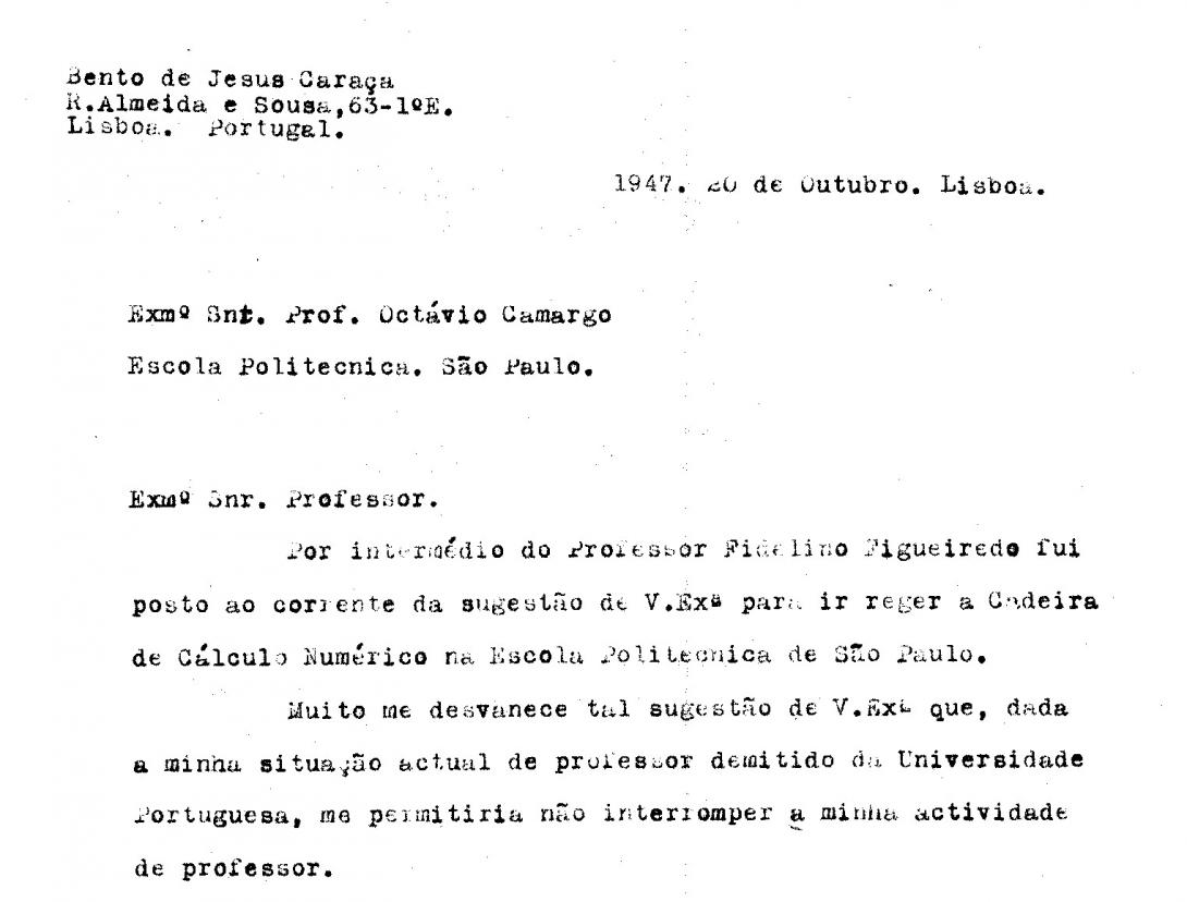 Data 20-10-1947 O convite, que lhe chegou através de Fidelino de Figueiredo, fie-lhe endereçado pelo Prof. J.O. Monteiro de Camargo, que desempenhou um papel relevante no ensino de cálculo diferencial e integral e de análise na Universidade de São Paulo.