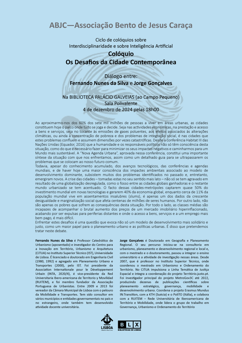 04-12-2024 Cartaz da sessão de 4 de dezembro de 2024 sob o lema "Os Desafios da Cidade Contemporânea" Sala Polivalente da Biblioteca Palácio Galveias